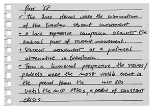 The corners of history inhabit large spaces that seem to evoke both memory and erasure, and in fact operate under both registers. Mired in the state’s authorship, what one might find in the archive are the edges of truth, so we fill the gaps by questioning the archive itself, and the conditions of violence that might have produced it, as Azoulay cautions,5 or that they produce in crafting the official story. It is also true that while the archive indexes the past, it breathes in the new (the new reading, the new imaginings, the new characters, places, ideas...); it is living, which suggests that “it is present, ongoing, and continuing.”6 We may take this to mean that it is in its passive state, silently huddled around other materials. The task is then to strip 1968 from the symbolic power ascribed to a particular geography and a particular narrative.